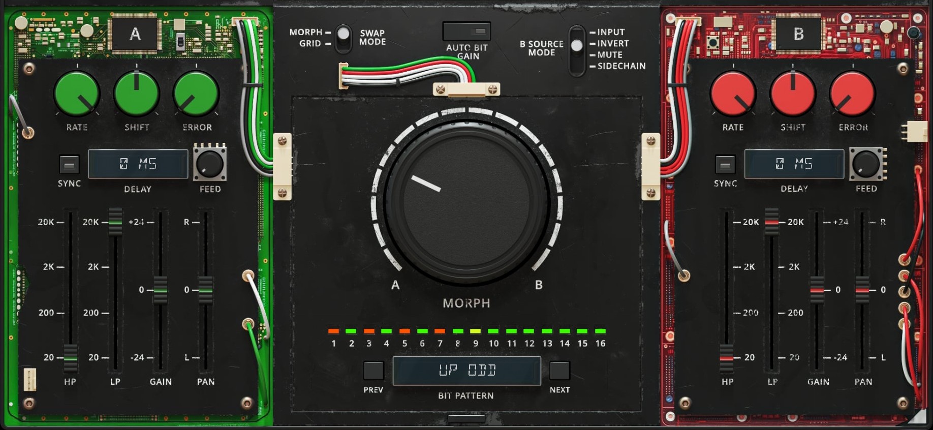 To the left and right, you can find the A and B channel controls, colour-coded green and red. The controls here are per-channel and are designed to create differences between A and B for the bit-swapping to have an effect.