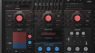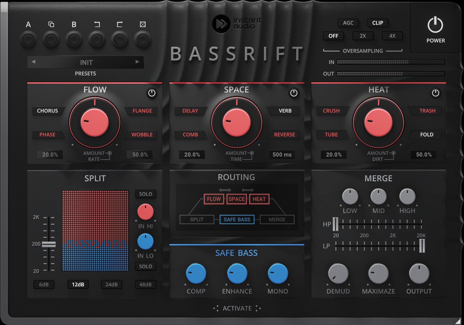 The Split section of BassRift divides the incoming signal into two streams at a selected crossover point: the lower frequencies are refined using the Safe Bass feature for enhanced solidity, while the upper frequencies are subjected to various effects for added texture and depth. Each section has an independent gain control, and you may decide the steepness of the crossover.