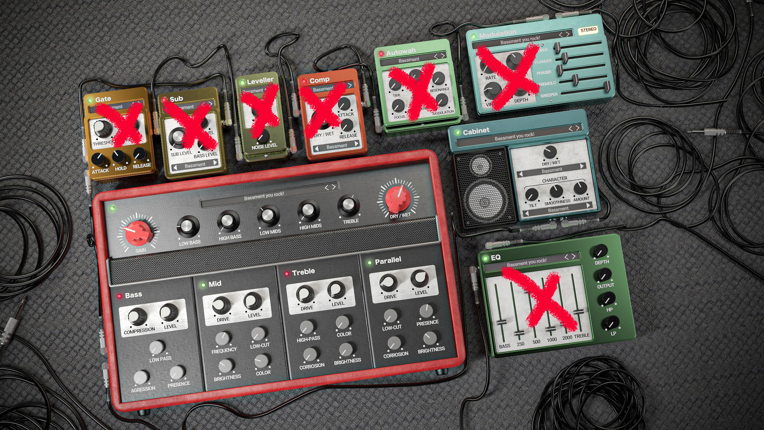 One amp is enough if it is truly universal. Bassment's amp doesn't go to eleven but its input gain goes from gentle to brutal. And it has a perfectly tuned 5-band EQ that matches any style. Even when mentioning the amp's dry/wet control we may say: That's not all!
