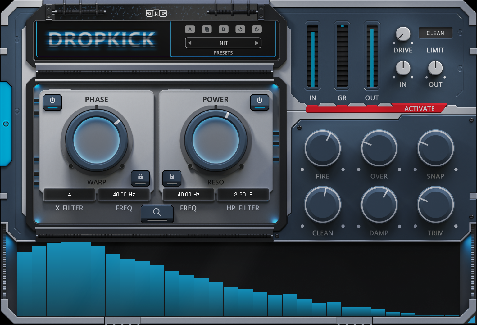 FIRE uses psychoacoustic techniques to enhance the sound of the kick. The low end is re-synthesized and harmonically enhanced while The mid and high frequencies are processed with analog-modelled saturation adding warmth and brighness. OVER is a dynamics processor based on an "over the top" compression technique, that has been fine-tuned for kicks. It brings out high end detail and tames the mids, while stabalising low end dynamics.