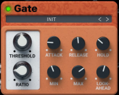 Gate, commonly known as Noise gate lets you remove passages, where you are not playing the guitar at all, however noise, hum and leakage from other instruments may still be present in the input signal and would become highly amplified by all the amping and distortion stages in Electrum. It also lets you be even more aggressive and produce a certain choppy sound especially useful for modern metal genres, where everything needs to be very precise and quick attacks are appreciated. Gate is usually the first item in the processing chain.
