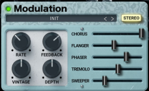 Rather than having several stompboxes Electrum's modulation section let's you blend multiple effects. This has many advantages. One of which is a perfect sync of the algorithms and it is way easier to operate. The effects are executed serially in the order you see in the GUI (cannot be changed).