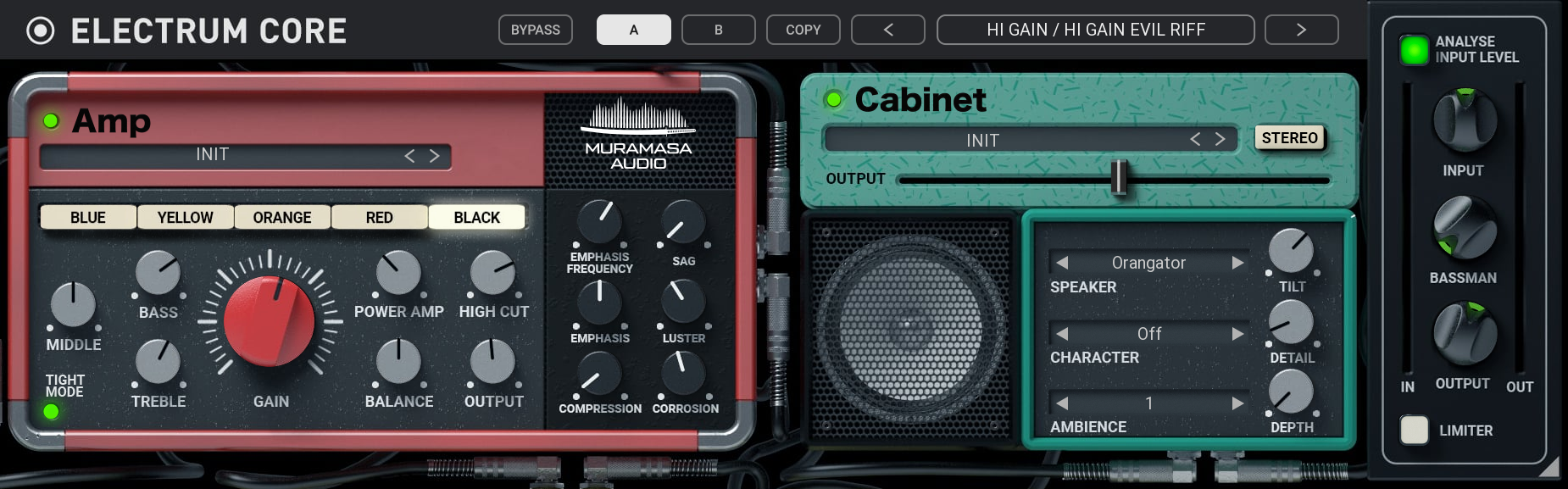 Hit Analyse Input Level button and hit the strings of your guitar as hard as you intend to play. Electrum will set up the input level automatically to find the perfect sweet spot to match your signal's strength with the particular processors' ideal working point. Perfect gain-staging and volume balance helps to get the most out of Electrum.