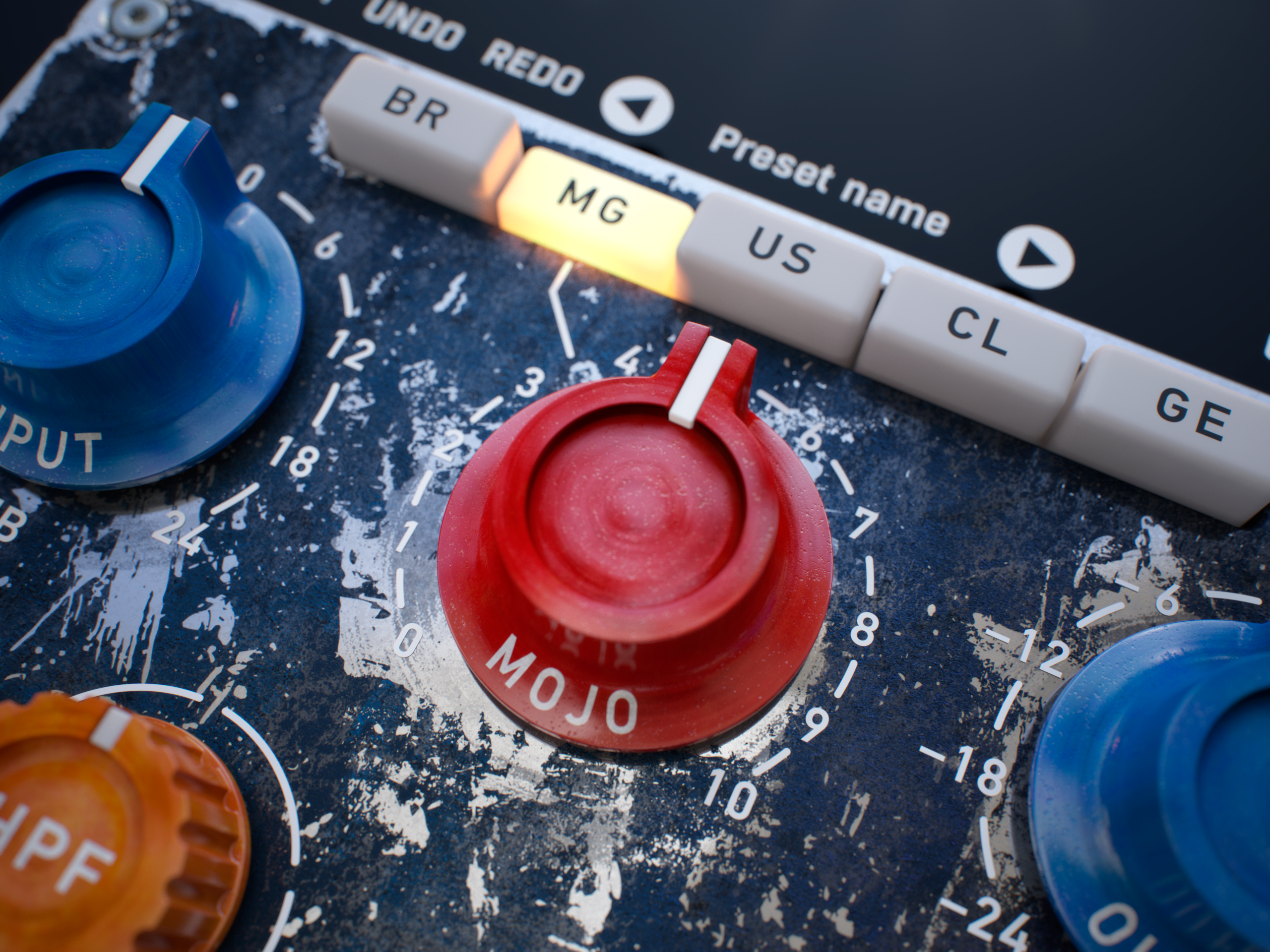 BR/MG/US/CL/GE buttons represent three types of analogue circuits you may choose from. BR represents classic fat British consoles; US stands for legendary punchy American-style input. Switching to GE will give you a velvet-sounding vintage German tube console. The newly added MG and CL buttons represent magnetic tape and clip saturation.