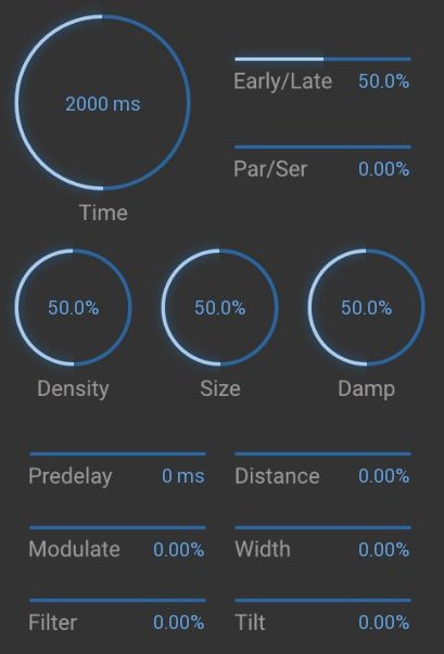 Time - Controls the RT60 measured in milliseconds. It is the amount of time it takes for the reverb level to drop by 60db, therefore, it controls the length of the reverb tail. Be aware that due to some of the special feedback algorithms this will not always be accurate.
