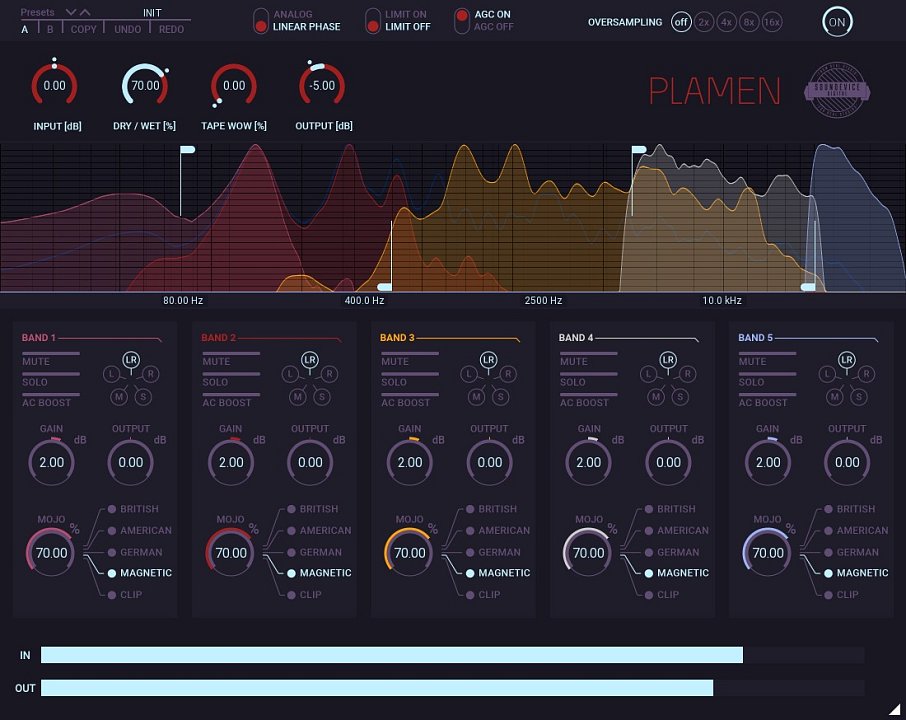 Plamen offers a diverse range of five distinct saturation types for each band, allowing you to choose the perfect colour and character for your audio. Each band can use three classic analogue preamp types, simulation of tape saturation (Magnetic) or clipping (a style of saturation— or distortion — characteristic of many beloved types of AD-driven input).