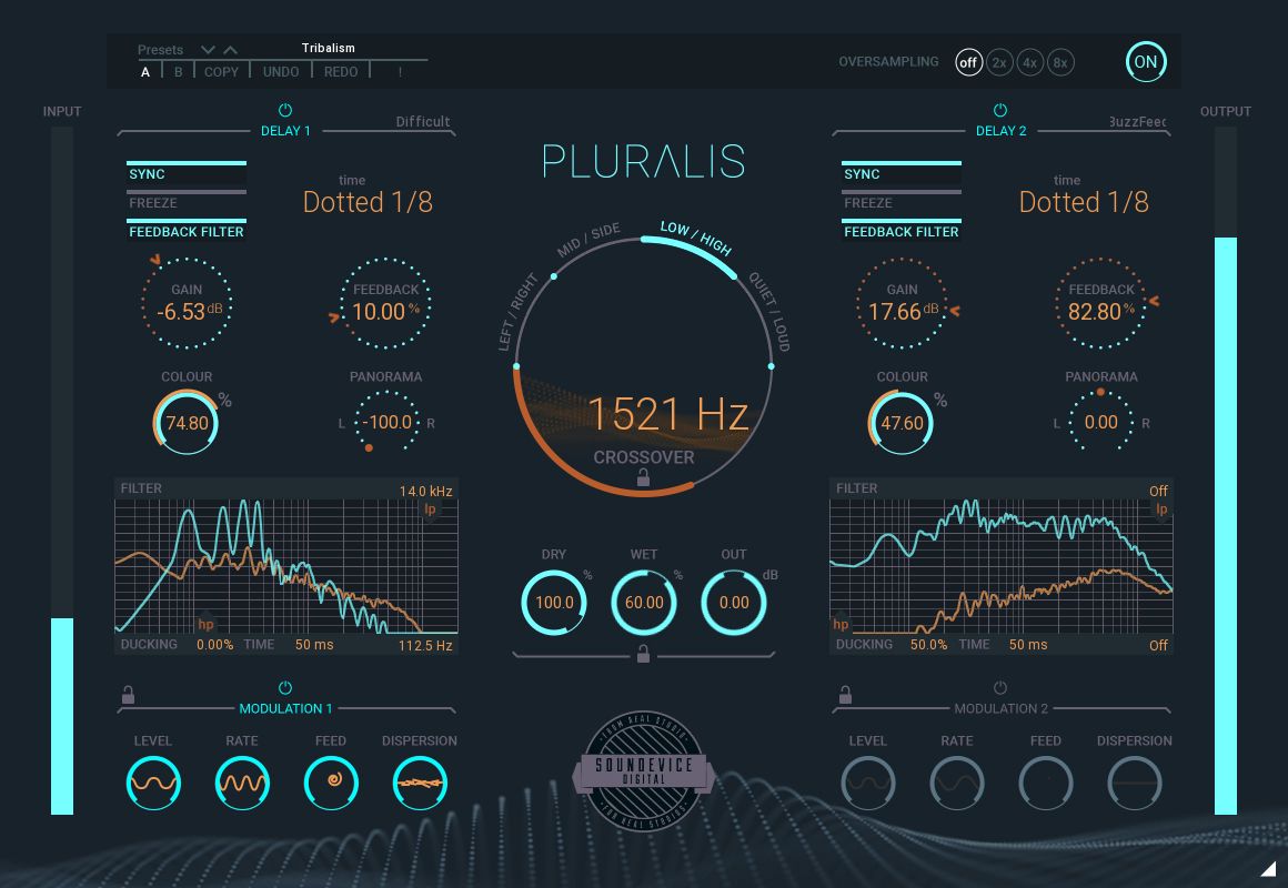 There are two Modulation sections on Pluralis and each one allows you to set values for the Level, Rate, Feedback and Dispersion of your modulation so you can finely tune how much modulation is set and applied to which parameters. It’s very flexible and powerful and allows you to get very dynamic delay results.