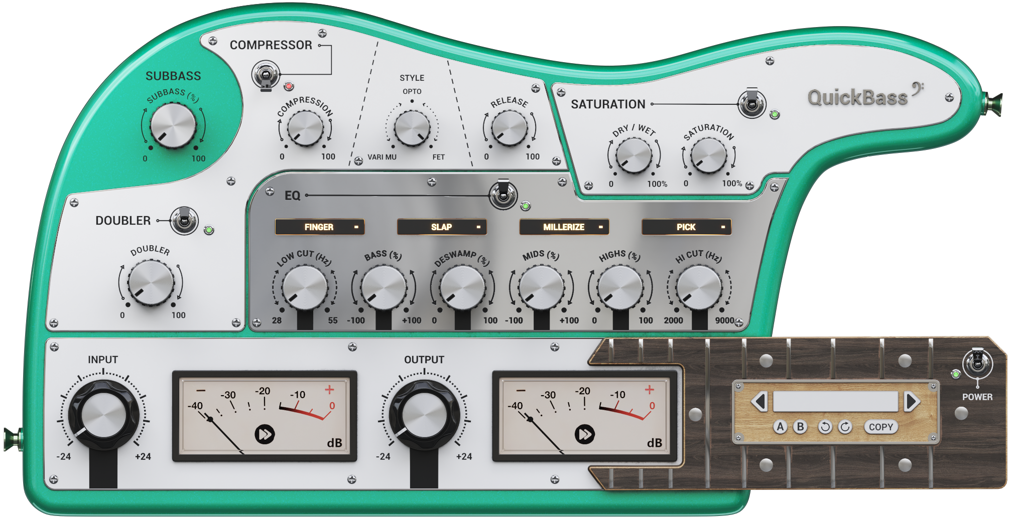 Bass is usually considered to be the coolest of all instruments. Mainly by the bassists. Recorded with a good DI, a fine bass often sounds perfect as you get it and needs just a little push here and there. And that is why we came up with QuickBass. To give you the quick EQ, quick compression, quick saturation, and fatness in no time. QuickBass is the ultimate bass polisher and finalizer.