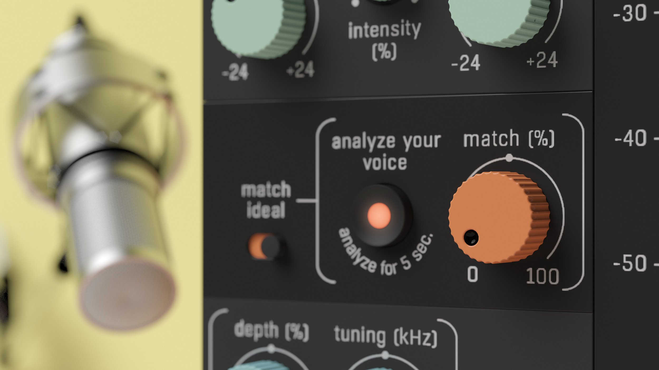 As if the finest EQ sweep was not enough, you may combine this feature with Voxessor's Intelligent Matching. Engaging the learn button (Analyze your voice) for a few seconds will detect your speaker's voice character. The Match function will then EQ it to sound as close to the ideal voice as possible.