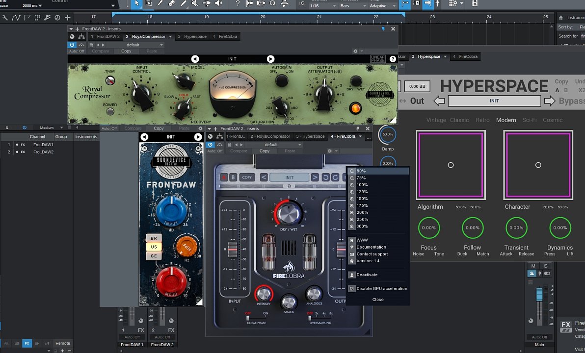 The term "secret weapons" may be a bit exaggerated in this case, we must admit. But still, there are two features that may ease your life with Front DAW, Hyperspace, Royal Compressor or FireCobra (and of course future plugins too).