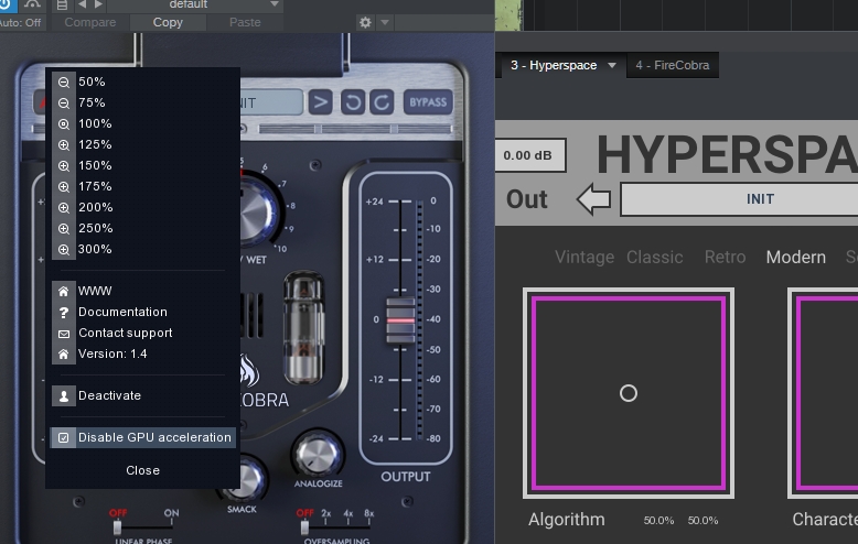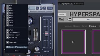 Click anywhere in the plugin background with the right mouse button (alternative click on Mac). You will get access to the following features: Scale GUI precisely by per-cent. Get the version info so that you can see if your plugin is up to date. Access product web page, reach support and access online documentation. You may also Activate/Deactivate the plugin and Disable/Enable GPU Acceleration. This may come handy when you experience graphics issues on older systems that we support.